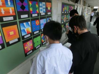 上:1年教室前 1年生絵画「イメージを文様で表そう」