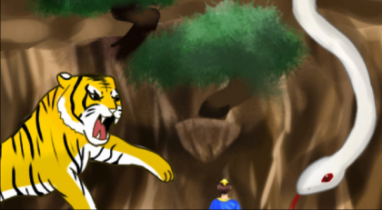写真上 演劇部「杜子春」 朗読:有坂さん、イラスト:清水さん