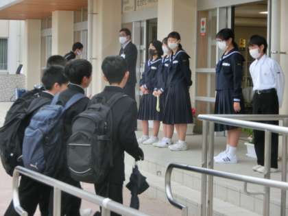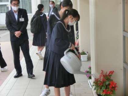 玄関では、生活向上委員会の1年生が、爽やかな挨拶で全校生徒を出迎えました。ボランティア委員会の生徒は、花の水やりを行いました。
