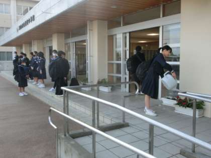 玄関では、生活向上委員会の1年生が爽やかな挨拶で全校生徒を出迎えました。ボランティア委員会の生徒は、花の水やりを行いました。