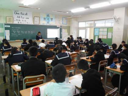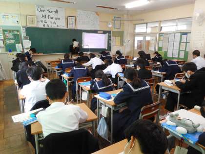 今回は、班ごとに代表者1名ずつが前に出て発表を行いました。発表を聴いている生徒も、しっかりと発表を評価していました。