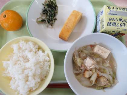 ごはん 大漁鍋 厚焼き玉子 磯和え みかん 牛乳