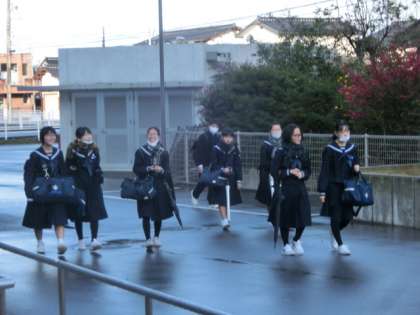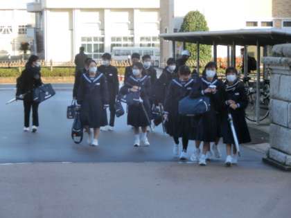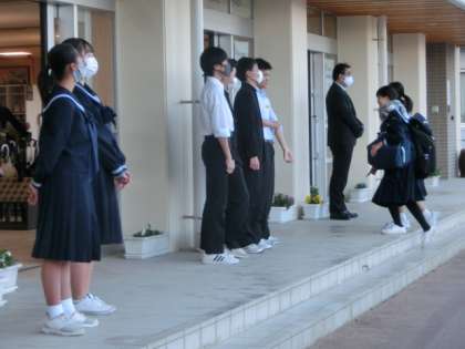 11月10日(火) 登校風景 公開日 2020/11/10 更新日 2020/11/10 全学年 今朝は、日が差して幾分柔らかな気候でしたが、手袋やマフラー等の防寒具を身に付けた生徒が増えてきました。 玄関では、生活向上委員会の3年生が爽やかな挨拶で全校生徒を出迎えました。