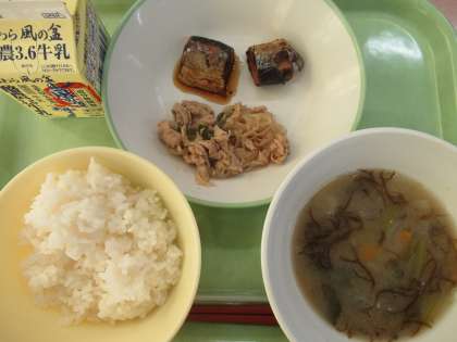 ごはん 秋刀魚の生姜味 豚肉と白滝のピリ辛炒め もずくの味噌汁 牛乳