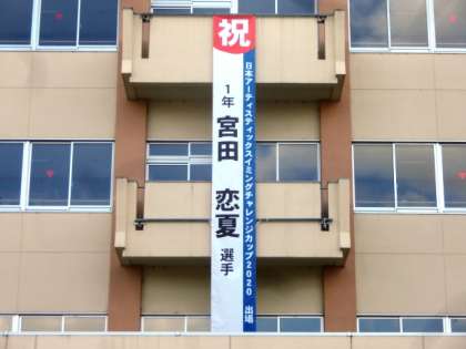 祝意を表すとともに健闘を祈念し、懸垂幕を作成しました。大会は、明日15日(日)まで行われます。抱負で述べた通り、練習の成果を出せるよう精一杯演技してくれることを願っています。