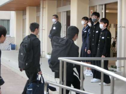 穏やかな週の幕開け。速中生は、今朝も元気に登校しました。玄関では生活向上委員会の1年生が、爽やかな挨拶で全校生徒を出迎えました。