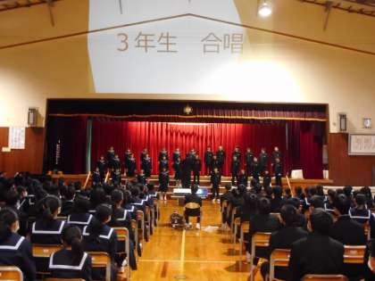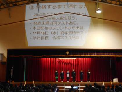 1年生は、5限に学年集会を行いました。はじめに、後期学年生徒会のメンバーが自己紹介を行いました。次に、学年生徒会の担当生徒が学力向上プロジェクトの説明を行いました。最後に、3年生の2クラスが合唱コンクールで歌った曲を、1年生に向けて体育館で再度歌ってくれました。3年生の素晴らしい歌声を聴き、学んだことが多かったと思います。