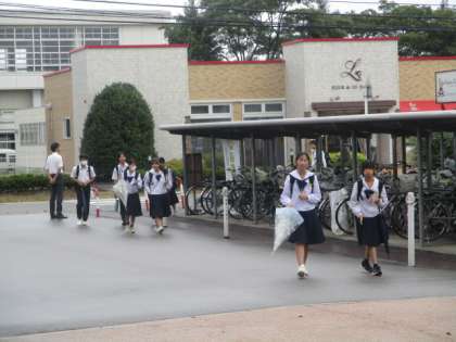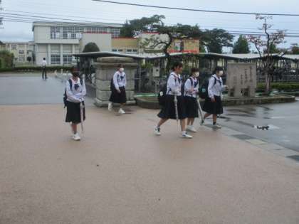 今朝の登校時は小雨になりました。今日は中間考査の初日です。本日の下校完了時間は13:55です。