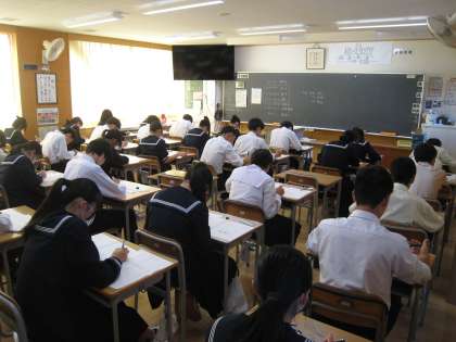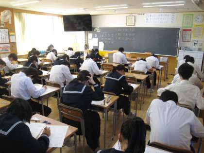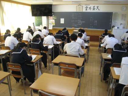 3年生は確認テストに取り組んでいます。本日は社会・国語・理科を実施します。写真は