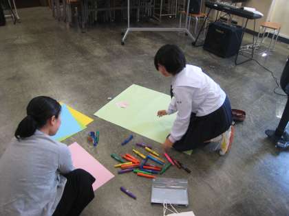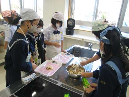 学校で活動している部活動の様子です。英会話部は英語劇の練習をしています。家庭科部は調理実習に取り組んでいます。合唱部は掲示物を作っています。