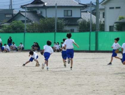 11Hの保健体育では、ソフトボールの授業で相手チームが打ったボールをキャッチして守備側チーム全員が集合するのと、攻撃側チームの打者が打った後、コーンを回ってホームベースに戻ってくるのを競争しています。攻撃側が速ければ得点、守備側が速ければアウトとして、みんな一生懸命に走っていました。