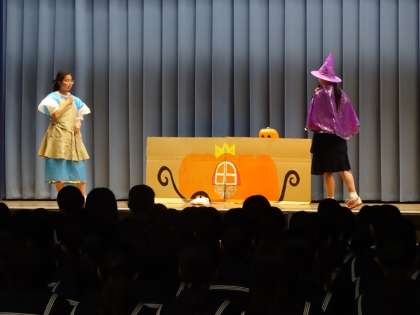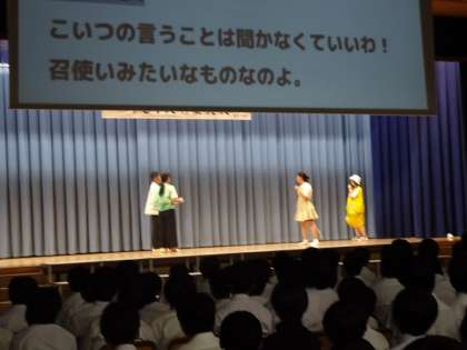 英会話部による英語劇です。「シンデレラ」を英語で発表しました。日本語訳もスライドで表示され、楽しく観ることができました。