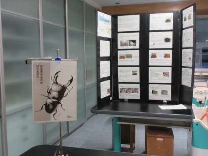 第1理科室には、1学年と2学年の自由研究の作品を展示しています。