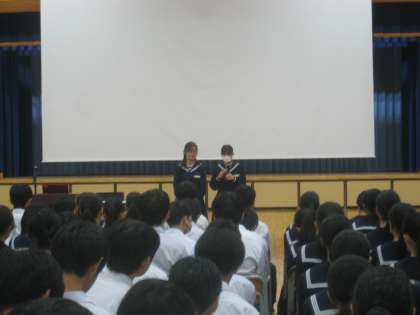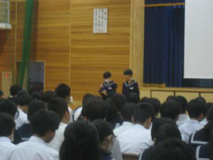 本日1限、2年生は、明日の金沢校外学習に向けて結団式を行いました。