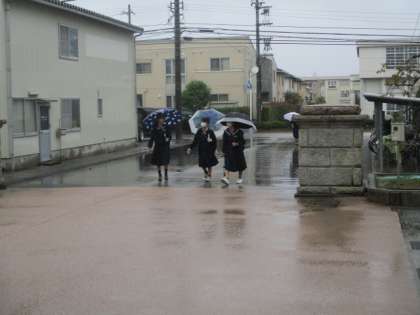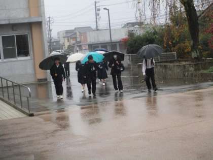 今朝の登校時は雨になりました。今日は1限から3限に中教研学力調査の3教科を行います。本日の下校完了時間は17:05です。