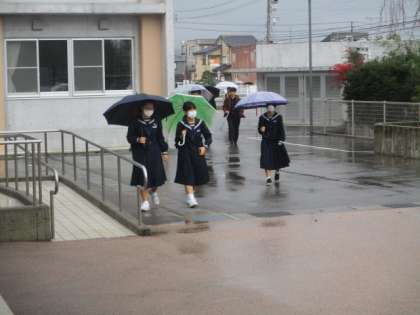 今朝の登校時は雨になりました。今日は午後から道徳の要請訪問(研修会)を行います。本日の下校完了時間は研究授業を行う17H、23H、35Hを除いて13:20です。