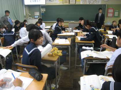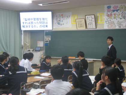 1年生は、「本が泣いています」という資料を使い、【公共の精神】について話し合いました。
