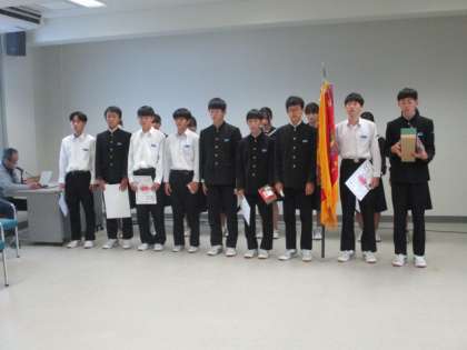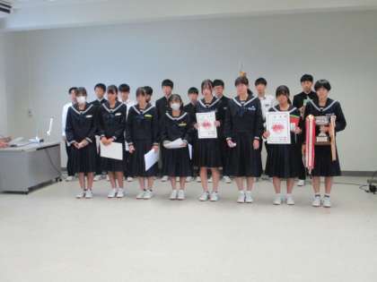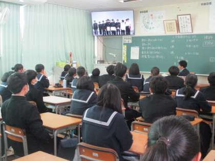4限に受賞報告会を行いました。富山市中学校新人大会の受賞を中心に多くの賞が紹介されました。写真は富山県中学校駅伝競走大会で1位になった駅伝部男子と2位になった駅伝部女子の様子です。