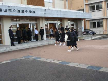 今朝の登校時は晴れになりました。生活向上委員の1年生があいさつ運動をしています。本日の下校完了時間は16:55です。