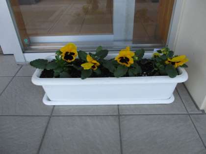 今朝の登校時は晴れになりました。玄関のプランターの花が新しくなりました。本日の下校完了時間は16:50です。
