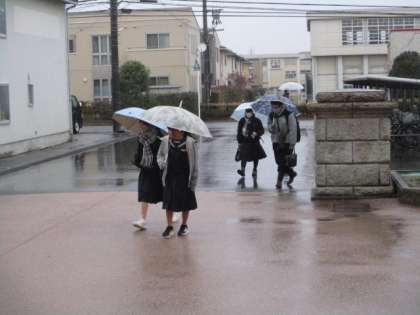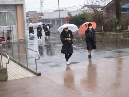 今朝の登校時は雨になりました。本日の下校完了時間は16:50です。