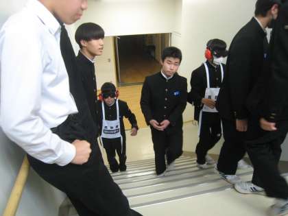 高齢者の低下した視力や筋力を体験し、福祉の重要性を学んでいました。