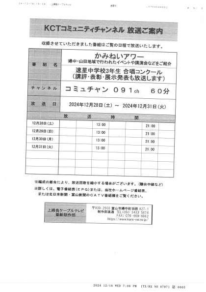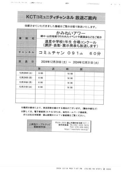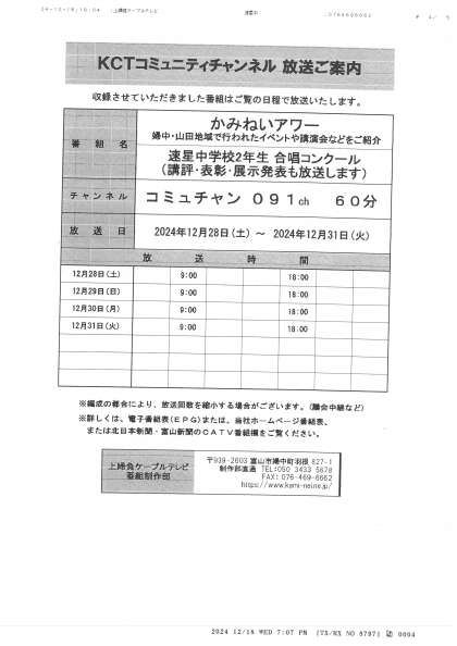 先般開催しました合唱コンクールについて、上婦負ケーブルテレビから放映日時の連絡がありましたので、お知らせします。