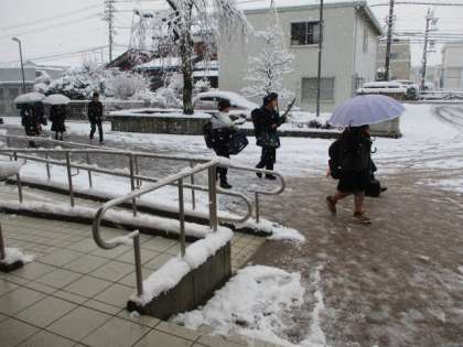 今朝の登校時は雪になりました。玄関前も雪に覆われています。本日の下校完了時間は16:05です。
