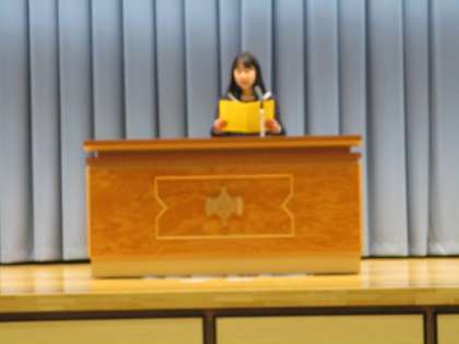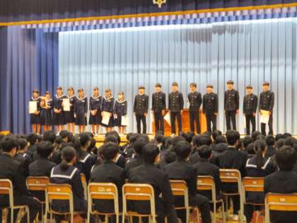 終業式の前に受賞報告会と意見発表会を行いました。意見発表会では2年生の代表生徒がこれまで頑張ってきた部活動の経験を学校生活にも生かしたいと述べました。