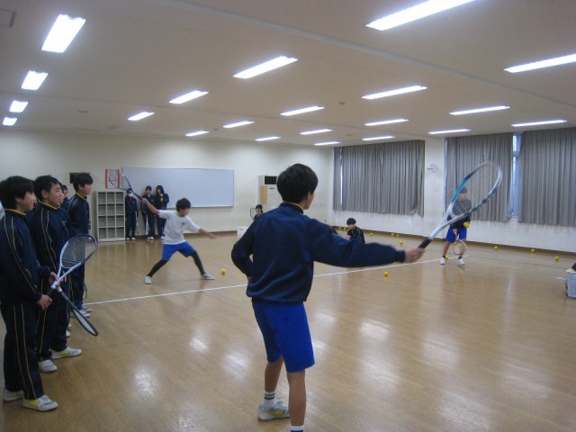 多目的ルームAでは、ソフトテニス部がスポンジボールを使って、返球の練習をしていました。