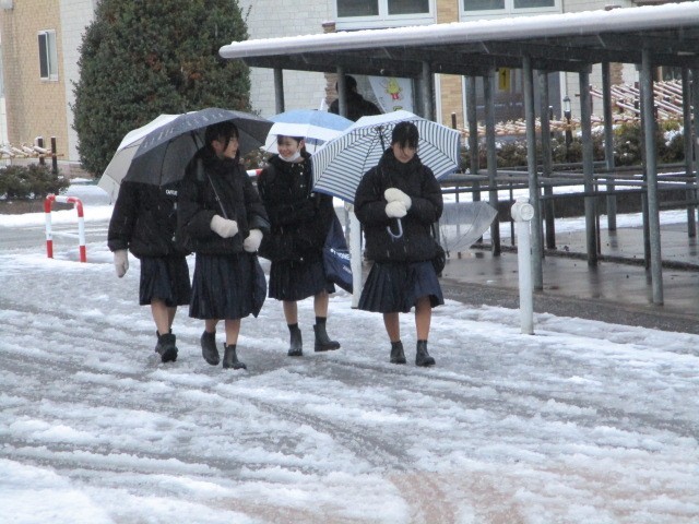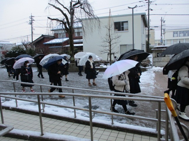 今朝の登校時は雪になりました。今日は1、2年生が冬休み明けテストを行います。本日の下校完了時間は15:50です。