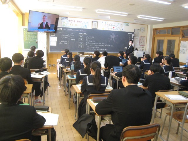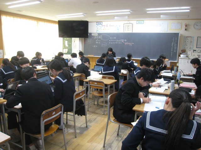 22H美術 美術でもタブレット端末を使って制作したポスターの作品紹介を行い、互いの作品の鑑賞を行っています。