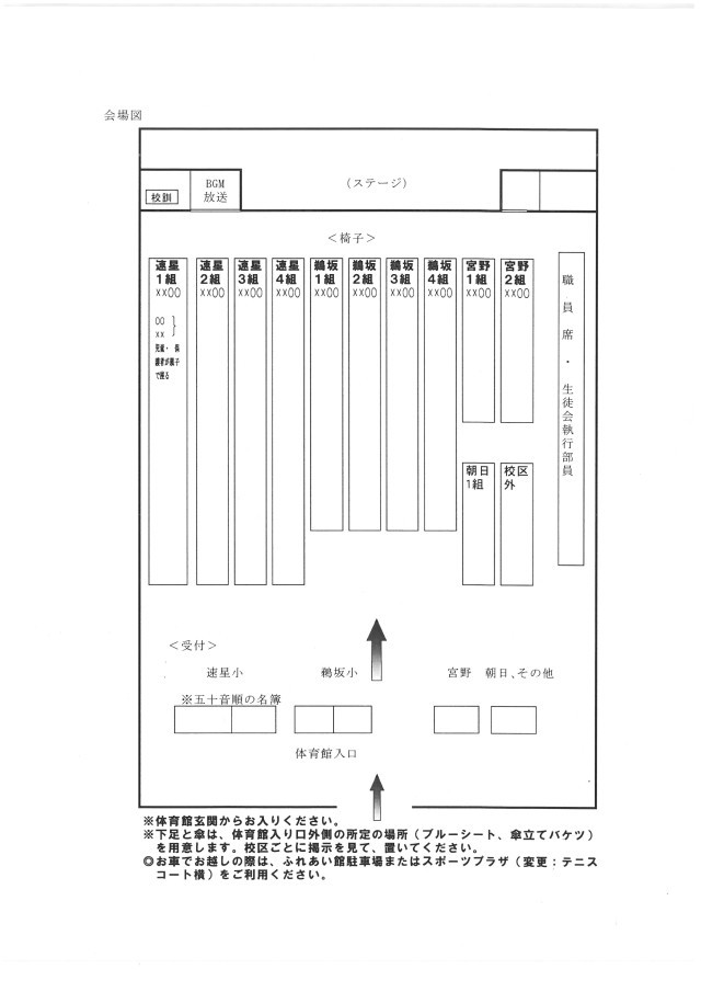 また、体育館内の「会場図」、「保護者案内」(再掲)も併せてご確認ください。よろしくお願いします。