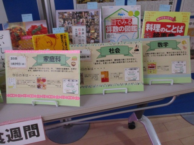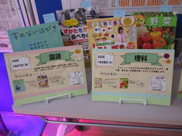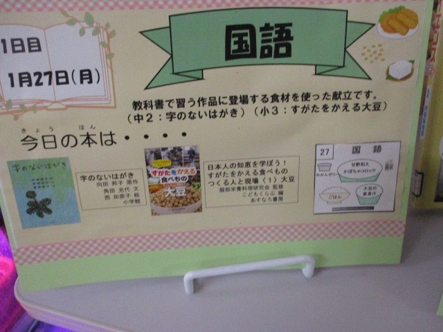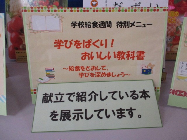 1月27日(月) 学校給食週間「学びをぱくり!おいしい教科書」 公開日 2025/01/27 更新日 2025/01/27 全学年 今週は学校給食週間です。今年のテーマは「学びをぱくり!おいしい教科書」です。様々な教科の学習内容にちなんだ献立になります。現在、献立で紹介している本が展示されています。今日の教科は国語で、教科書で習う2つの作品に登場する食材を使った給食でした。 +2