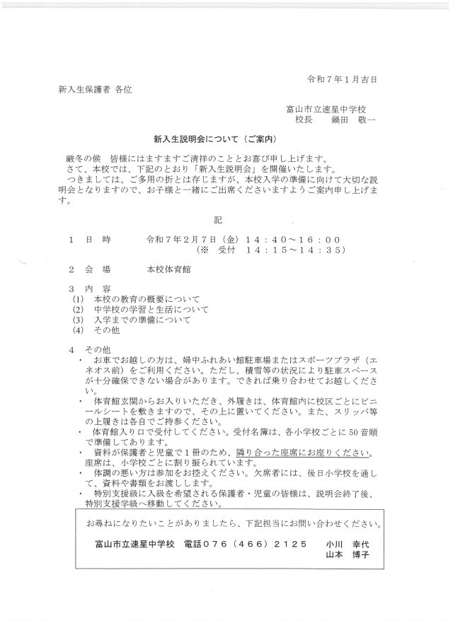 現在、当日の降雪が心配されますが、今のところ日程に関する変更はありません。「保護者案内」も併せてご確認ください。よろしくお願いします。