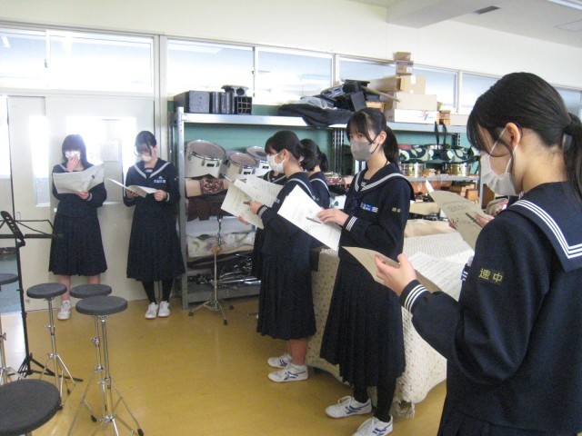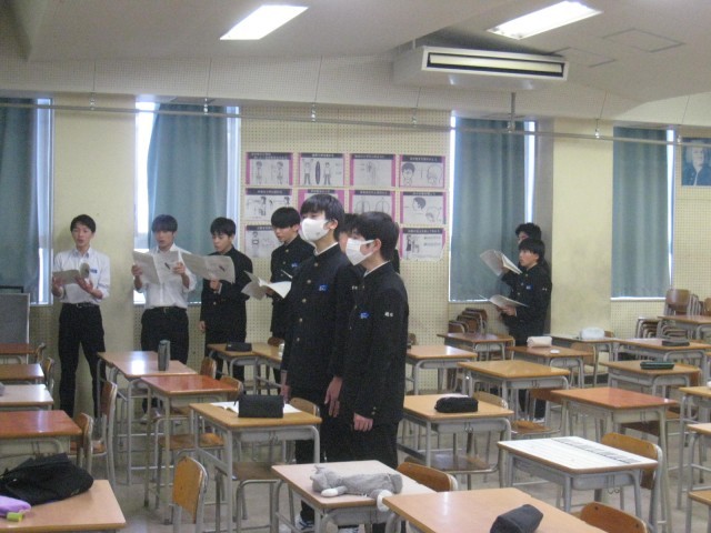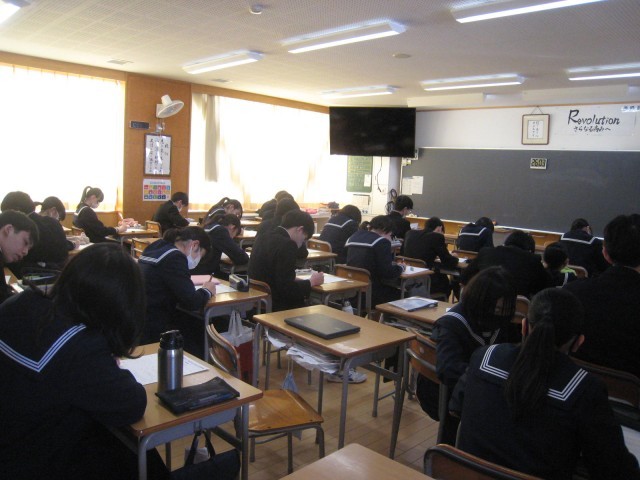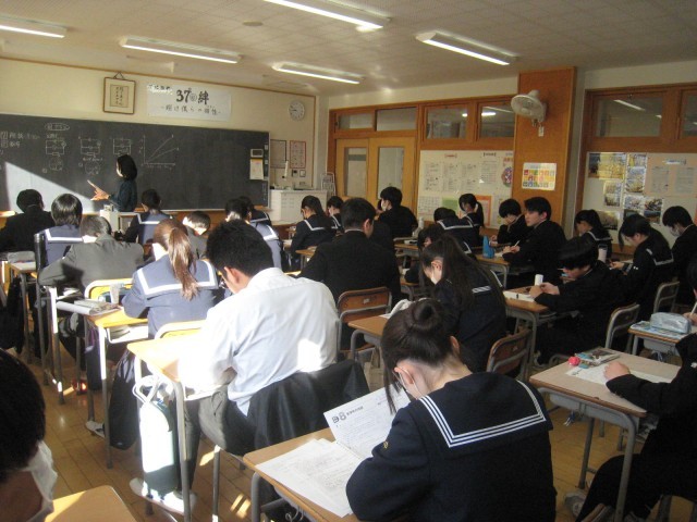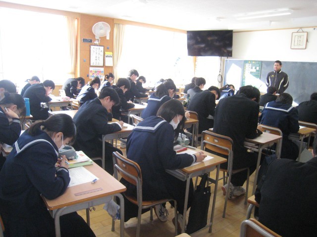 3年生の1限の授業の様子です。授業の多くは、明日に控えた私立高校入試に向けて、意欲的に学習を続けていました。音楽では、「卒業の歌」を練習中でした。31H理科、32H理科、33H英語、34H数学、35H家庭、36H音楽、37H理科、38H英語、39H美術の授業です。