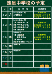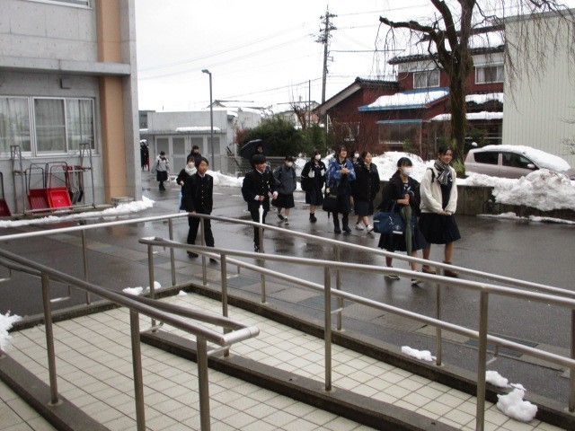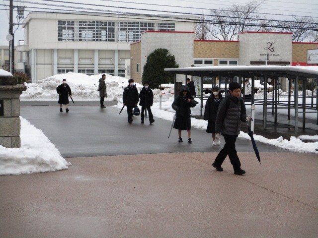 今朝の登校時は雨になりました。今日の放課後は部活動を行いません。本日の下校完了時間は14:55です。