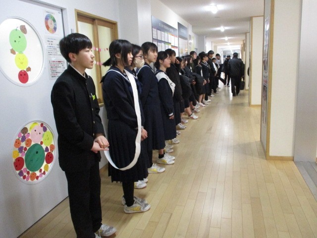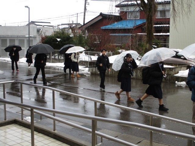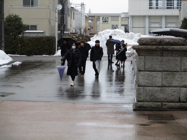 今朝の登校時は雨になりました。玄関の中では生徒会役員選挙の選挙活動が行われています。本日の下校完了時間は16:15です。