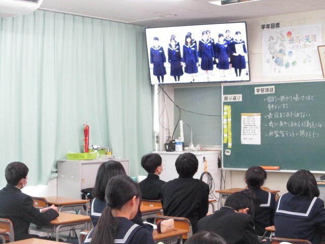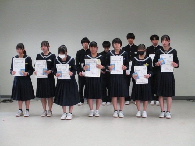 4限に各教室への配信の形で受賞報告会を行いました。写真は陸上競技で北日本新聞スポーツ記録賞を取った選手たちです。