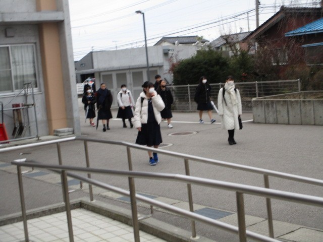 今朝の登校時は曇りになりました。今日は1、2年生の学年末考査の最終日です。本日の下校完了時間は13:55です。