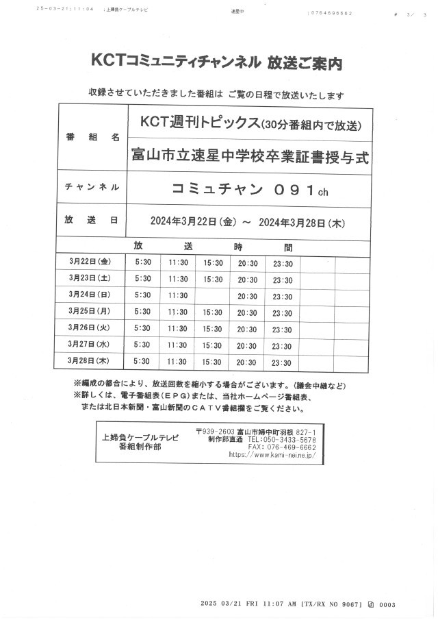 【上婦負ケーブルテレビから】卒業証書授与式の放映について