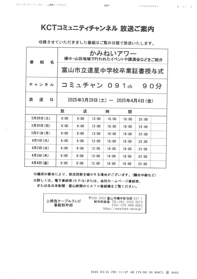 先般開催しました卒業証書授与式について、上婦負ケーブルテレビから放映日時の連絡がありましたので、お知らせします。