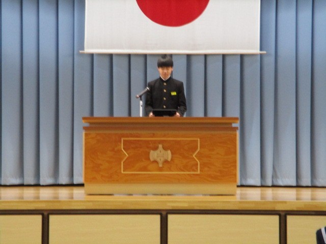 1年生の代表者が意見発表を行いました。生徒会執行委員としての経験や今後、頑張っていきたいことを述べました。