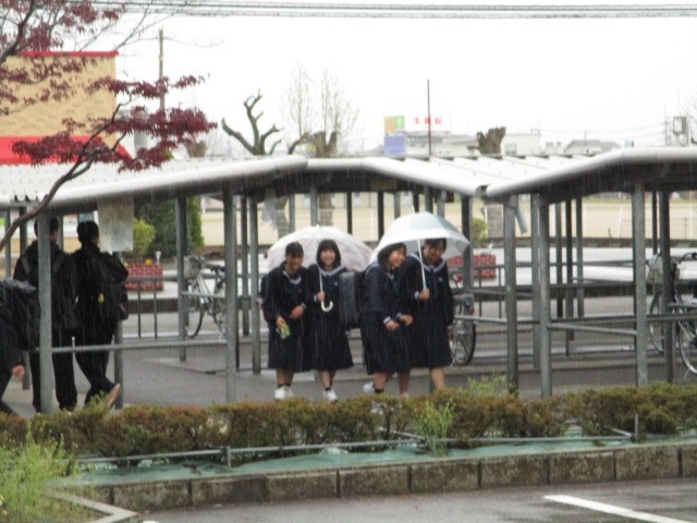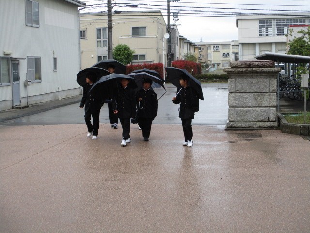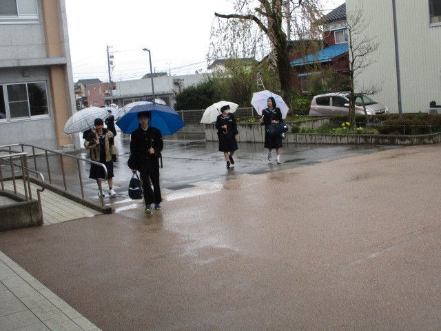 今朝の登校時は雨になりました。今日は午後から1年生に向けた部活動紹介を行います。本日の下校完了時間は16:55です。