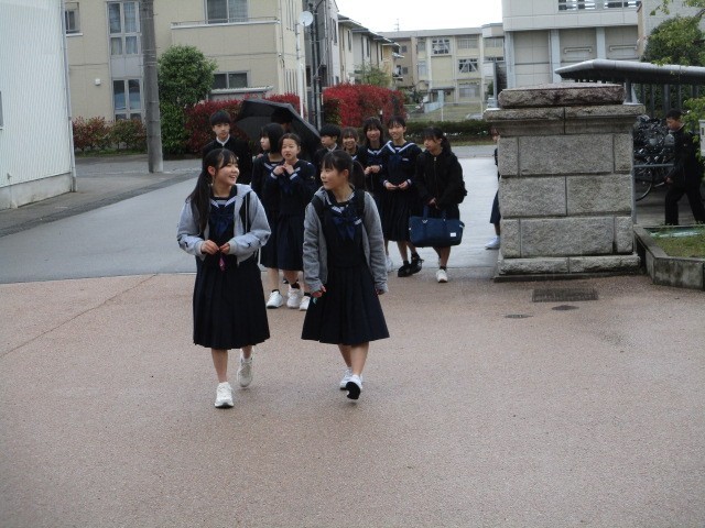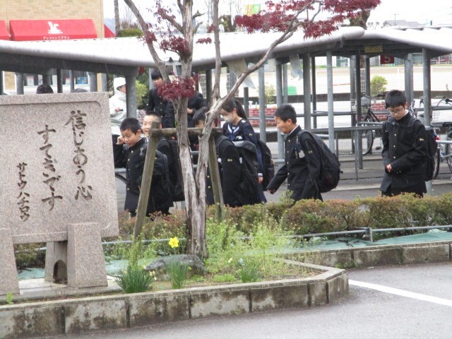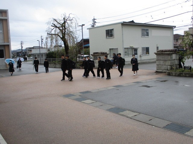 今朝の登校時は小雨になりました。今日は創校記念式、志を高める集会、生徒会入会式を行います。本日の下校完了時間は15:55です。