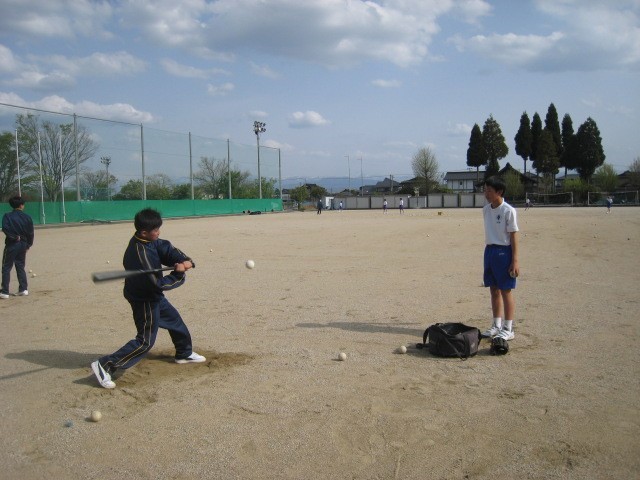 上:野球部 先輩にボールを投げもらってTバッティングに挑戦です。