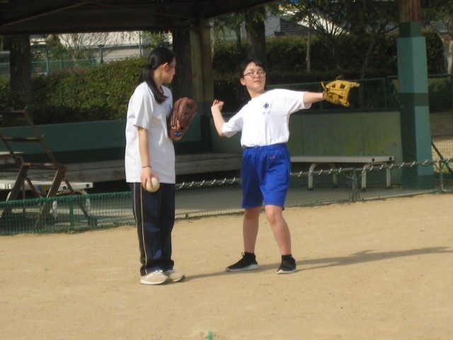 中:ソフトボール部 先輩にフォームを確認してもらいながら、キャッチボールをしました。