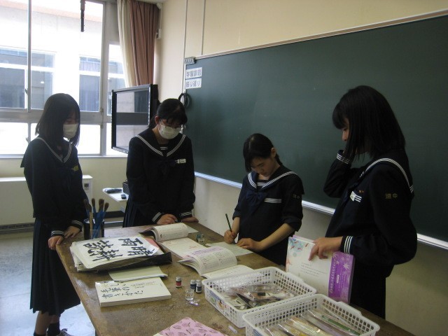 下:書道部 先輩に教えてもらって、ガラスペンで文字を書きました。初めての書き心地にびっくりです。