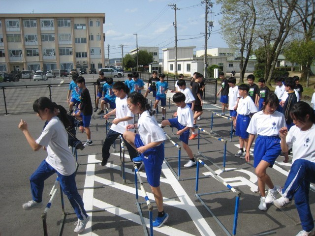 上:陸上競技部 ハードルを使ってウォーミングアップの後、グラウンドで走りました。