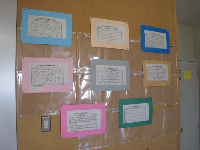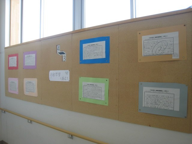 3年生の掲示板には、平和学習を終えての感想が並んでいます。5月11日からの修学旅行までカウントダウンです。